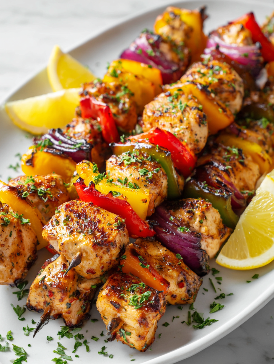 This chicken skewers recipe features tender, juicy pieces of chicken marinated briefly in a flavorful mixture of lemon, garlic, herbs, and spices. The method involves marinating, threading onto skewers, and grilling until golden and smoky, resulting in a visually appealing, flavorful bite with a slight char and succulent texture.