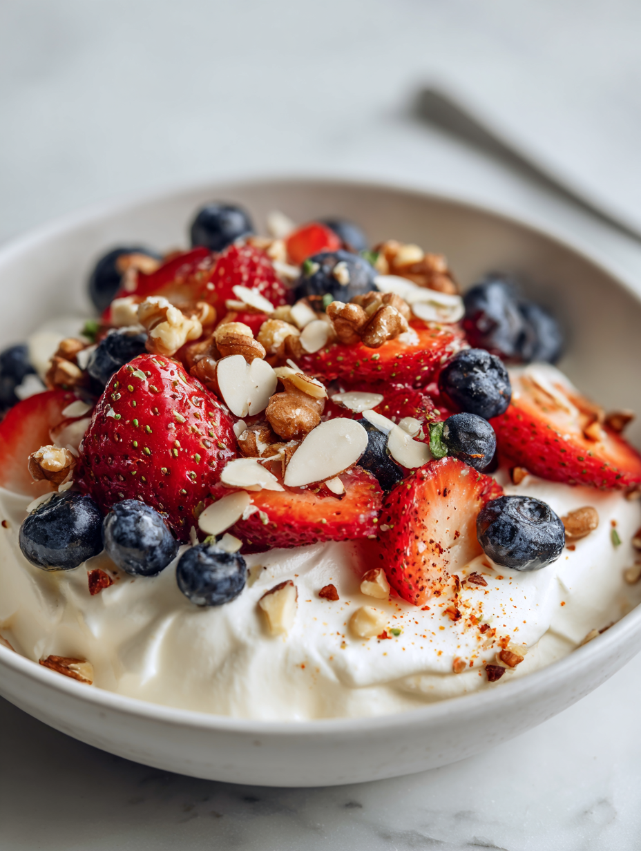 - Gently serve immediately, enjoying the creamy, tangy base topped with vibrant fruit and crunchy nuts for a balanced, satisfying snack.