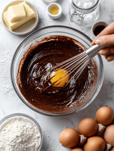 - Add in the eggs one at a time, whisking gently after each addition until fully incorporated. The batter should become smooth and slightly thickened.