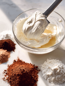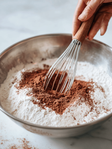 - In a large mixing bowl, whisk together the sifted flour, cocoa powder, baking soda, and salt until well combined. This creates a uniform dry mixture that ensures even distribution of flavors.