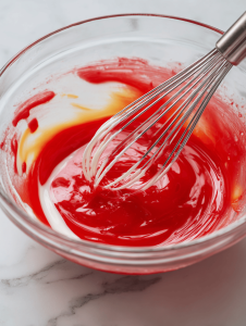 - In another bowl, combine the buttermilk, vegetable oil, red food coloring, vinegar, and vanilla extract. Whisk until the mixture is smooth and the color is evenly dispersed, with a slight glossy sheen.