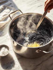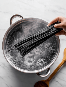- Add the black pasta carefully to the boiling water, stirring immediately to prevent sticking, and cook until just al dente, about 8-10 minutes.