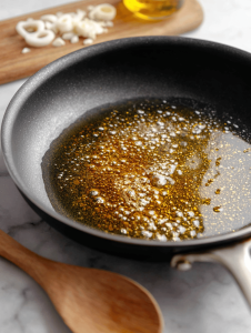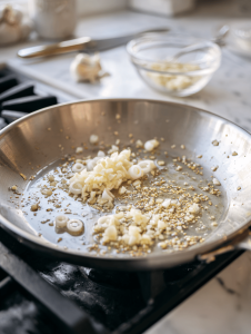 - Add the finely chopped garlic to the pan, sauté for about 30 seconds until fragrant and slightly golden.