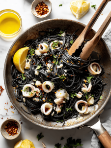 - Black pasta (or regular pasta + squid ink dye): The canvas for the ink—al dente is key, so don’t overcook. Use regular pasta if you can’t find the ink version.