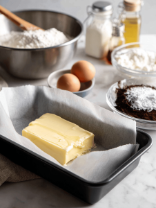 - Preheat your oven to 175°C (350°F). Line your baking pan with parchment paper, leaving some overhang for easy removal.