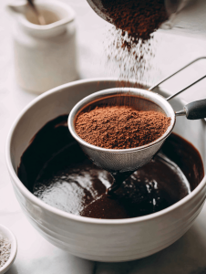 - Sift the cocoa powder into the bowl and add vanilla extract and a pinch of salt. Fold everything together gently, until the batter is dark, smooth, and uniform in color.