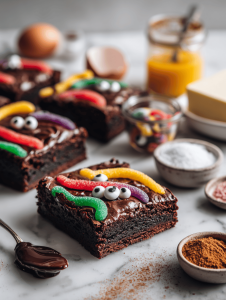 - Cut the cooled brownies into squares. Decorate with spooky icing, edible eyes, gummy worms, or other Halloween-themed candies to create creepy scenes.
