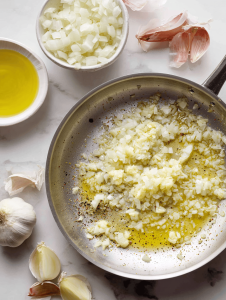 Step 3: In a skillet, sauté chopped onions and garlic in olive oil until fragrant and translucent, about 5 minutes.