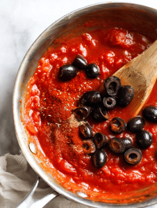 3. Add tomato sauce to the skillet, then stir in sliced black olives and smoked paprika. Let the sauce simmer gently for 10 minutes, thickening slightly and developing a smoky aroma.