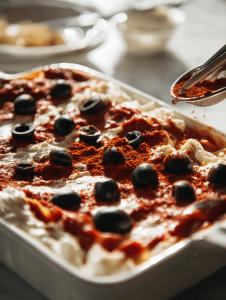 5. Sprinkle thin slices of black olives across the top to resemble spooky eyes, and sprinkle a little more smoked paprika for an eerie, smoky effect. Cover the dish loosely with aluminum foil.