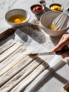 - Unroll the puff pastry sheets on a lightly floured surface and cut them into strips about 1 inch wide—these will be your wrapping strips.