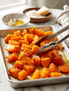 - Preheat your oven to 200°C (390°F). Toss the pumpkin chunks with olive oil, a pinch of salt, and nutmeg, then spread evenly on a baking sheet. Roast for 25-30 minutes until the pumpkin is deeply caramelized and fragrant, with a smoky aroma filling the kitchen.