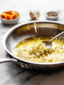 Step 3: Make the sauce: in a large skillet, melt butter over medium heat. Add minced garlic, cook until fragrant—about 30 seconds, don’t let it brown. Puree roasted pumpkin with a splash of cream and a pinch of sage, then stir into the skillet.