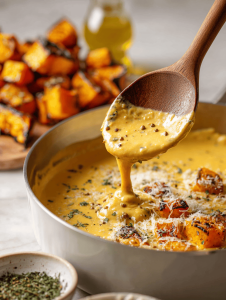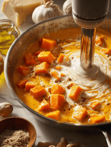 - Transfer the roasted pumpkin to a blender or use an immersion blender directly in the skillet. Add the cream and blend until smooth, creating a velvety, orange-hued sauce with a smoky aroma that complements the garlic.