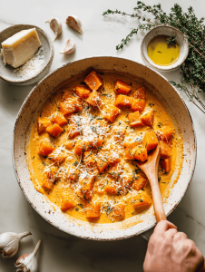 - Serve immediately, garnished with extra Parmesan or fresh herbs if you like. The sauce should be luxuriously creamy, with a smoky sweetness from the roasted pumpkin infusing every bite. Enjoy this cozy, surprising pasta dish!