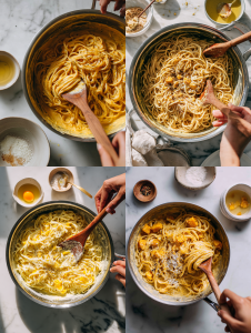 Step 4: Simmer the sauce gently, adding pasta water to loosen if needed. Toss in cooked pasta, stirring to coat evenly. Check for salt and pepper, adjust as you go. Serve hot, topped with grated Parmesan.
