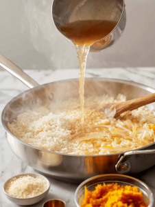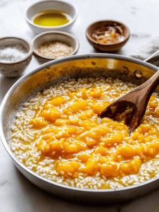 - Add the Arborio rice to the pan, stirring constantly to coat each grain with the pumpkin mixture. Cook until the rice turns glossy and slightly translucent at the edges, about 2 minutes.