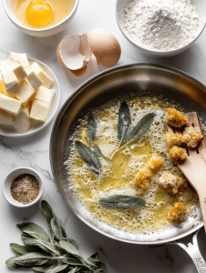 - While the ravioli cooks, melt butter in a skillet over medium heat until it begins to brown and smell nutty, about 2-3 minutes. Add the sage leaves and fry until crispy, about 1 minute, then remove from heat.