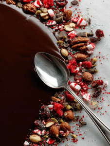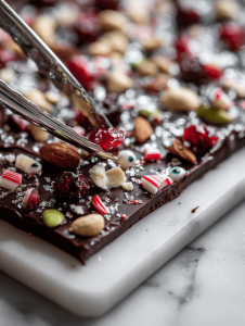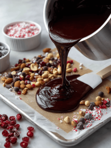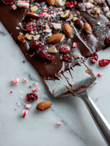 - Sprinkle the mixed nuts, dried cranberries, and crushed candy canes evenly over the warm chocolate, pressing them lightly into the surface to help them stick.