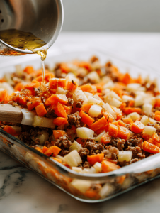 6. Transfer the cooked vegetables and meat mixture into your baking dish, spreading evenly.