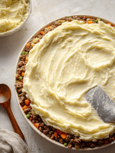 8. Spread the mashed potatoes over the filling in an even layer, smoothing with a spatula or the back of a spoon.