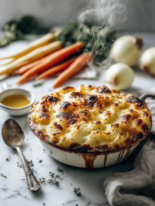 This Halloween twist on classic shepherd’s pie features roasted vegetables and a smoky, richly seasoned filling, topped with creamy mashed potatoes and a crispy golden crust. The dish combines hearty ingredients with a smoky aroma, resulting in a comforting yet slightly haunting presentation that’s perfect for cozy nights or festive gatherings.