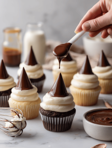 - Dip the top of each chocolate cone into the melted chocolate to create a glossy, shiny hat. Place the chocolate hats on the frosted cupcakes at an angle, pressing gently to secure them with a dab of frosting as glue.